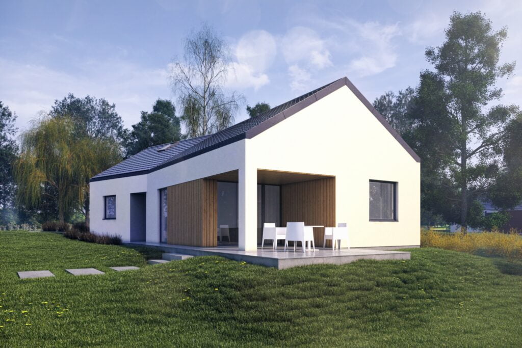 Inwestor nie zrealizował jednak pierwotnej, niewielkiej rozbudowy i po latach wrócił do nas po projekt nieco większego, ale wciąż relatywnie małego domu. Podobnie jak poprzednio, i tym razem założeniem projektowym była rozbudowa istniejącego budynku letniskowego, zlokalizowanego na pochyłej działce w miejskiej części Kiekrza